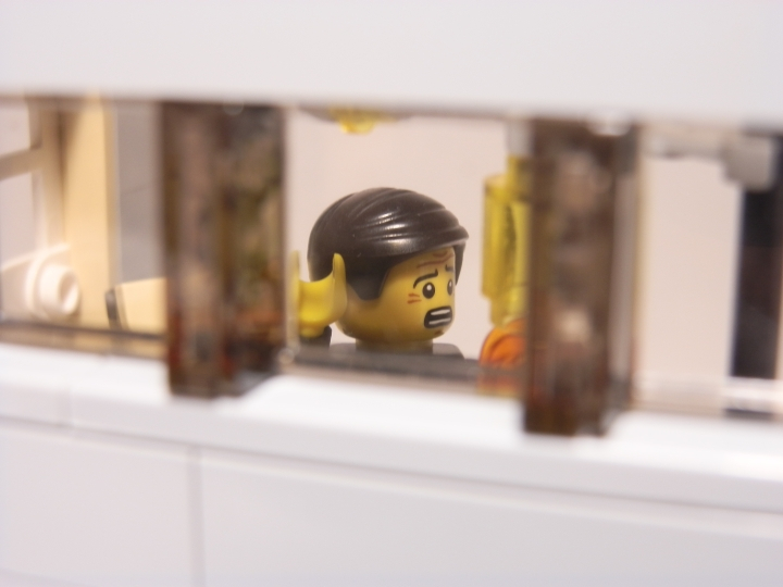 С улицы видно, что мужчина в здании чем-то напуган.