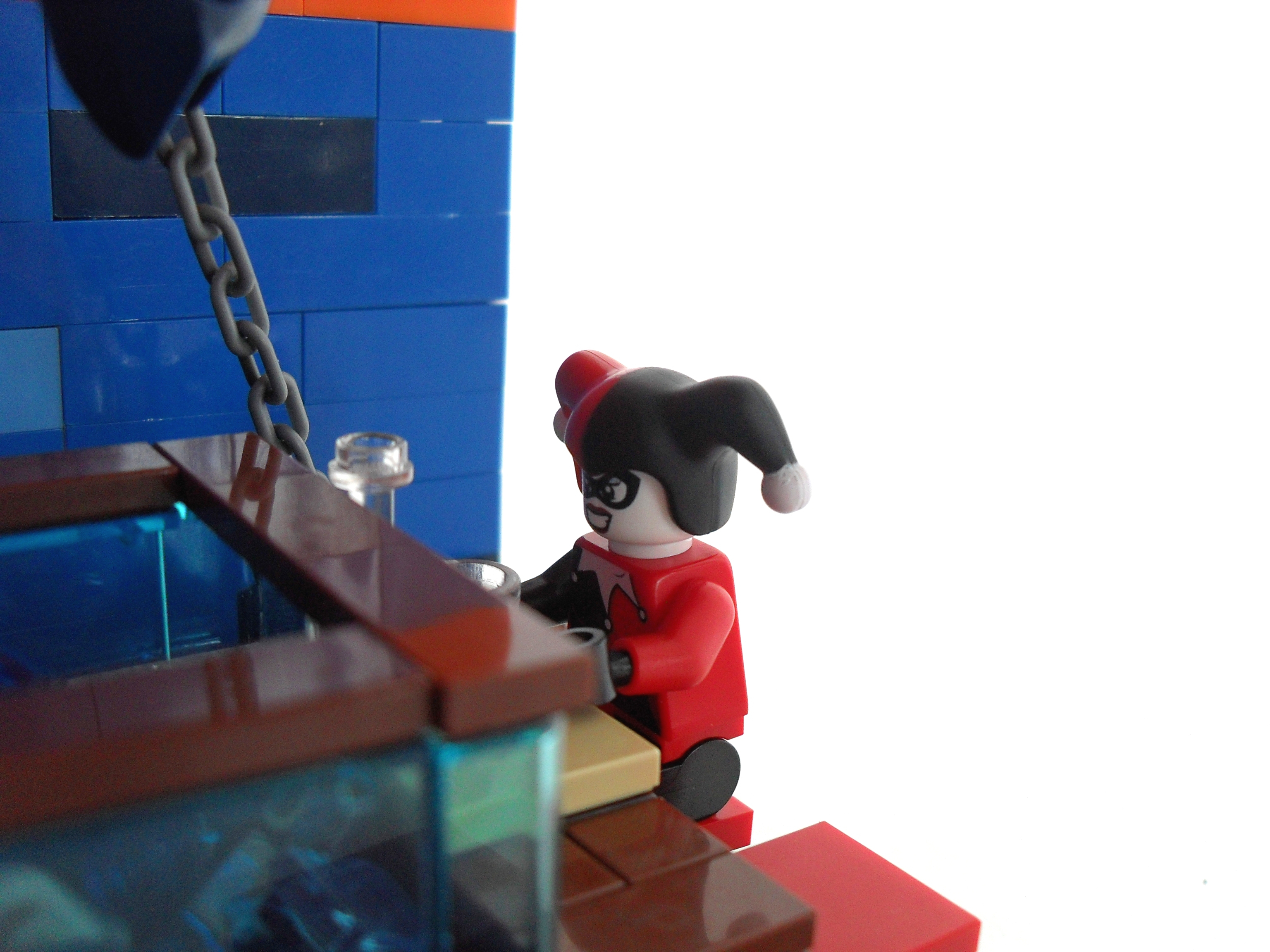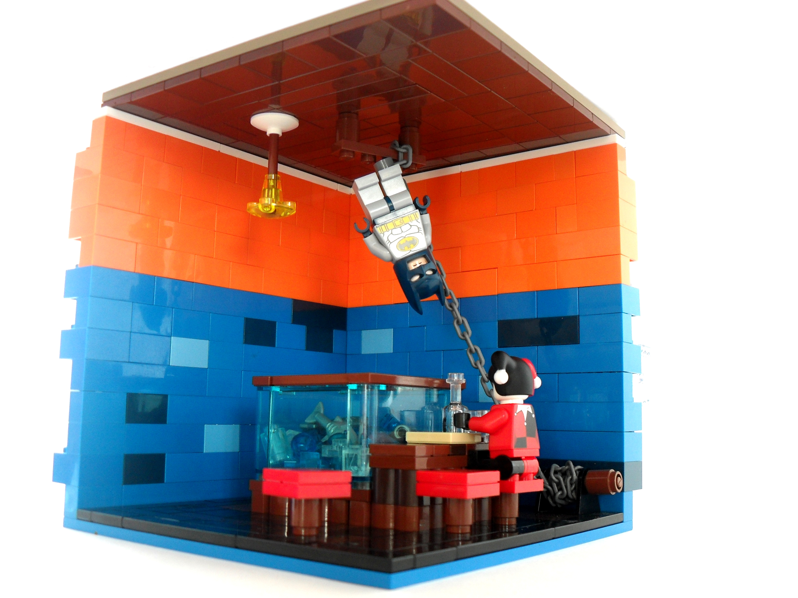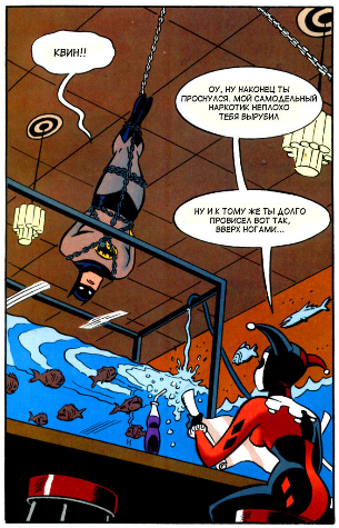 Квадратные стулья вместо круглых и странные стены уже меняют атмосферу комикса. К этому присоединяется и Бэтмен, который скорее повис над своей жертвой, чем оказался в ловушке. Аквариум больно мал и Темному рыцарю даже не стоит сопротивляться, чтобы не попасть в него. Но, и Харли тоже не хочет действовать по плану и смотрит не на свою жертв, а на бутылку или стенку аквариума.