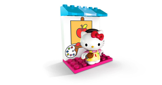 Collectionnez les quatre personnages Hello Kitty, pour créer un ensemble Hello Kitty pour toutes les occasions! L'Ensemble de peintre Hello Kitty de Mega Bloks comprend des contenants de peinture, des pinceaux, une palette et un paysage extérieur pittoresque que Hello Kitty peut peindre! Hello Kitty s'est beaucoup amusée à peindre et s'est tachée à quelques reprises, heureusement son sarrau lui a permis de rester propre.