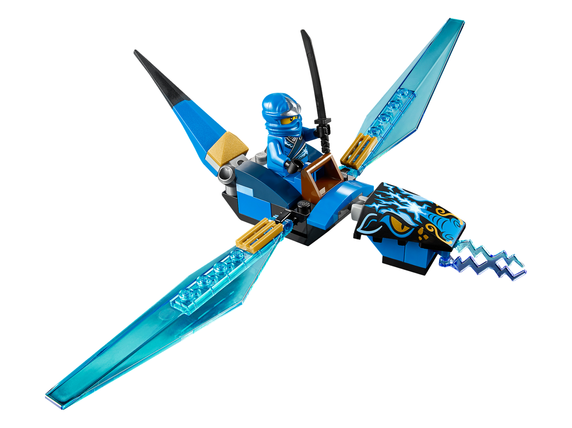 Wedge 4 x 4 No Top Studs with Dragon Head and 2 Golden Eyes and White and Blue Lightning Pattern (10725)