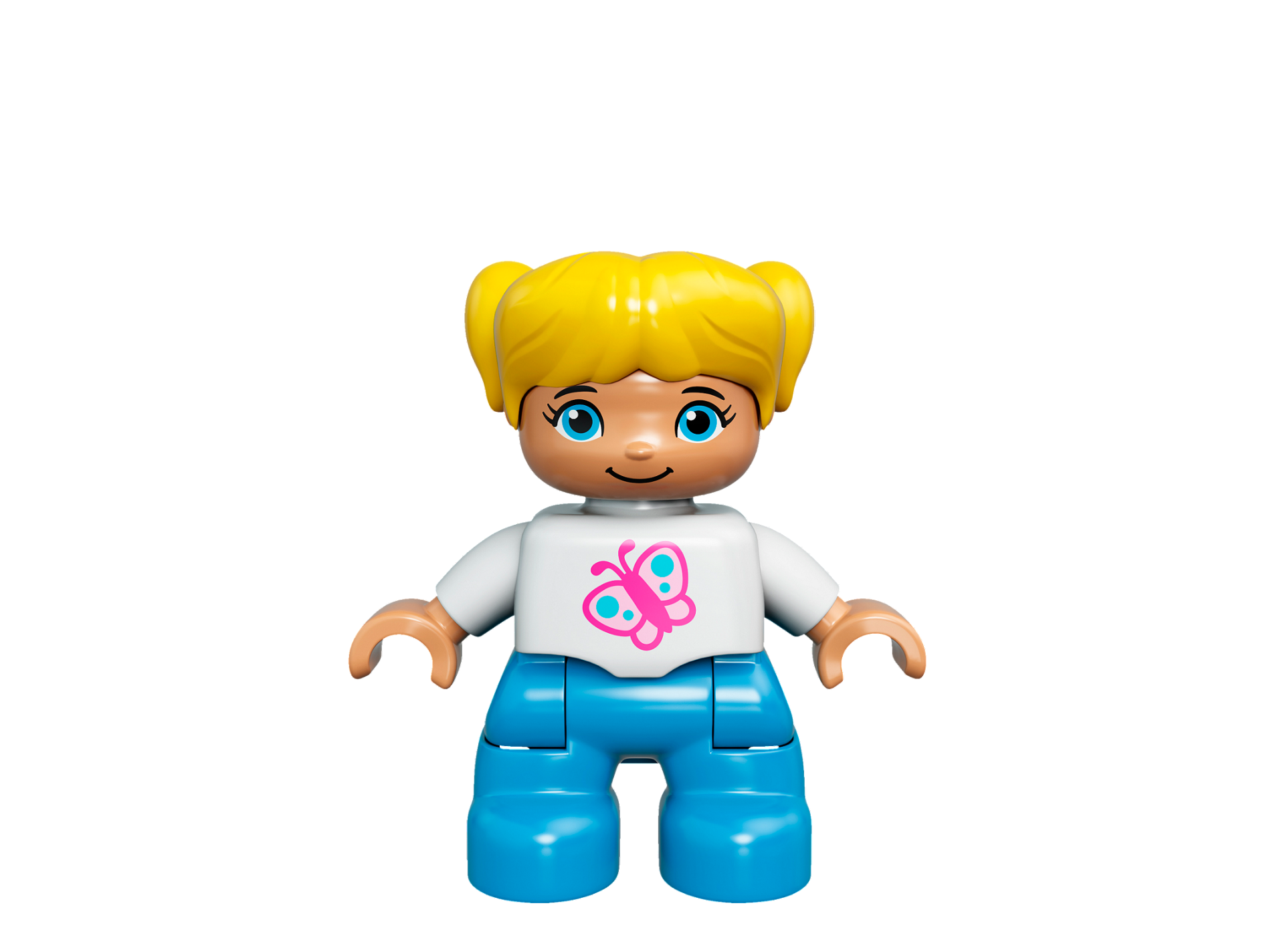 Duplo Figure Lego Ville, Child Girl, Dark Azure Legs, White Top with Pink Butterfly, Yellow Hair with Ponytails