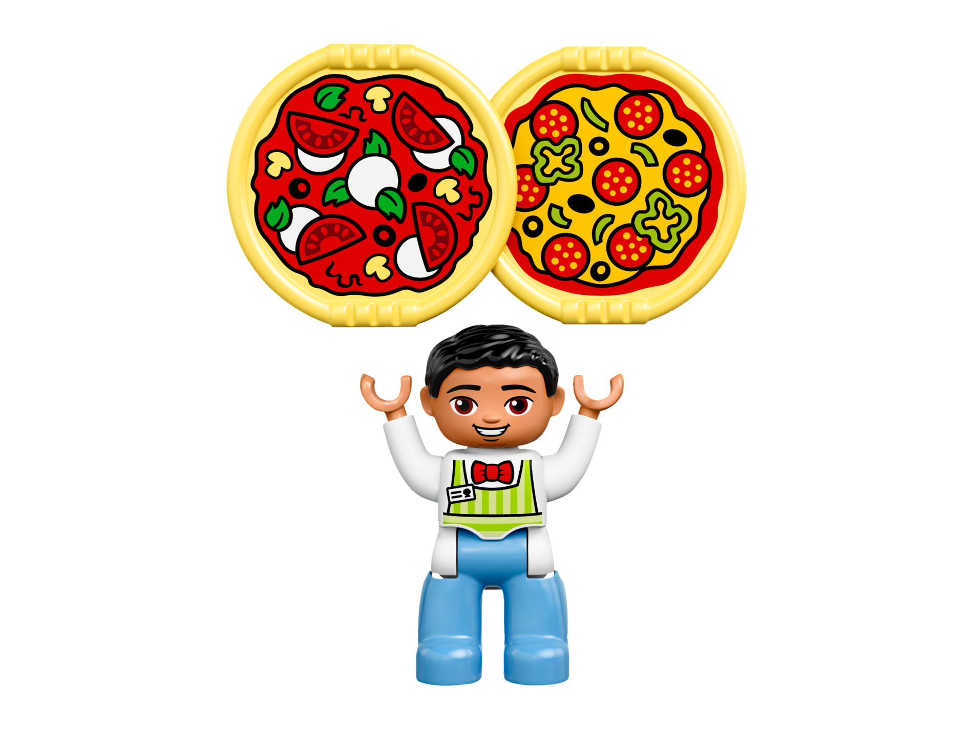 Duplo Figure Lego Ville, Male, Medium Blue Legs, Lime Striped Apron, Red Bow Tie, Black Hair