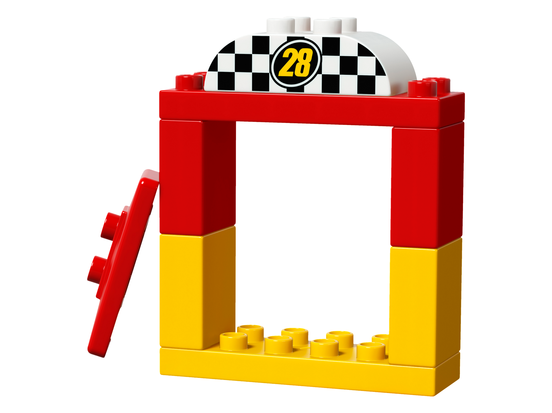 Duplo, Brick 2 x 4 Curved Top with Yellow '28' with Black and White Checkered Pattern