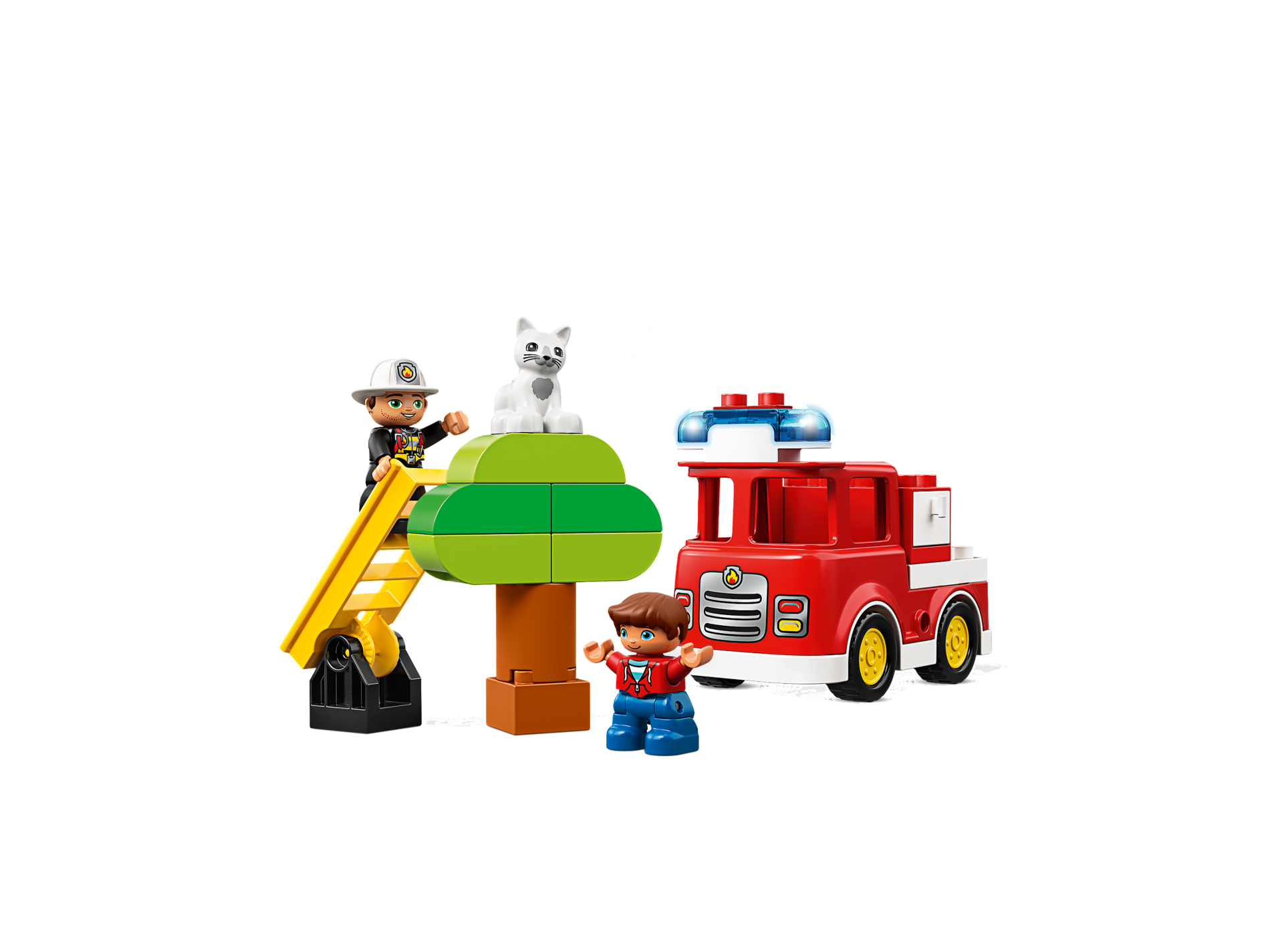 Duplo Figure Lego Ville, Male Fireman, Black Legs, Striped Jacket with Red Safety Harness, White Helmet with Silver Fire Badge, Green Eyes, Stubble