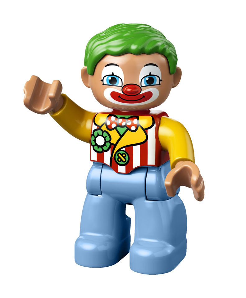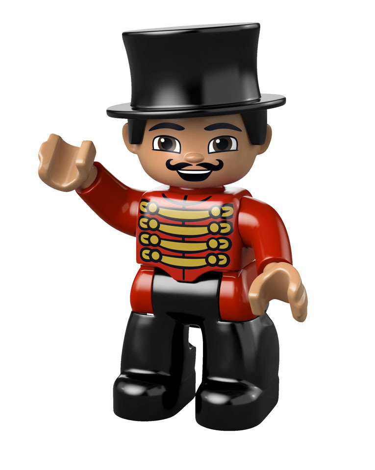 Duplo Figure Lego Ville, Male Circus Ringmaster, Black Legs, Red Top with Gold Braid, Top Hat, Brown Eyes