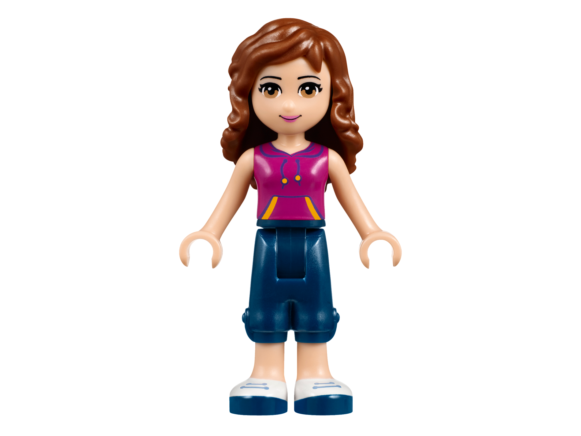 Friends Olivia, Dark Blue Cropped Trousers, Magenta Top with Yellow and Dark Purple Stripes