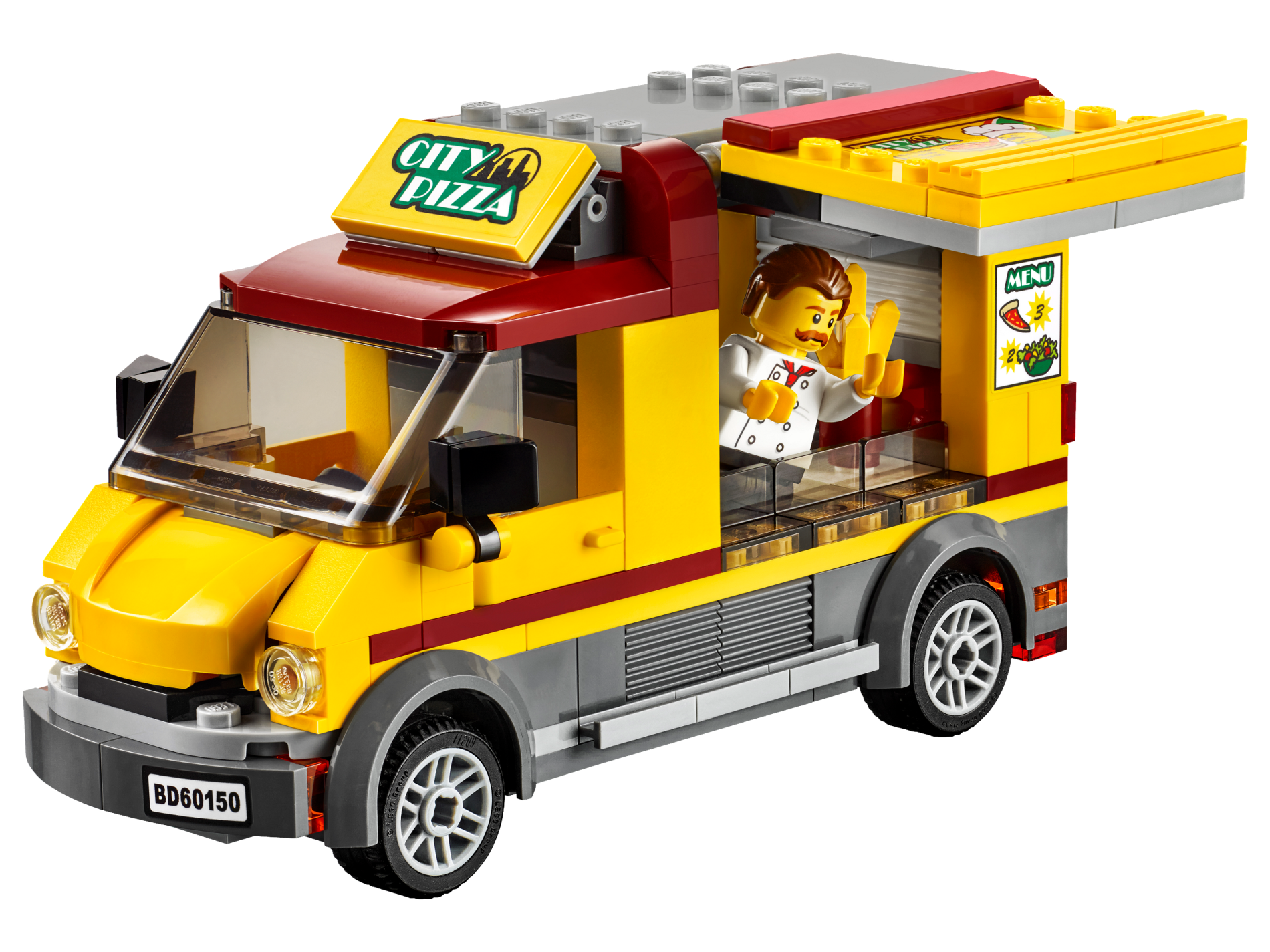 | 1 X Tile, Modified 4 x 6 with Studs on Edges with 'CITY PIZZA' and Store Hours Upper Left, Chef and Italian Flag Colors Pattern (Sticker) - Set 60150 | Yellow |   |  |