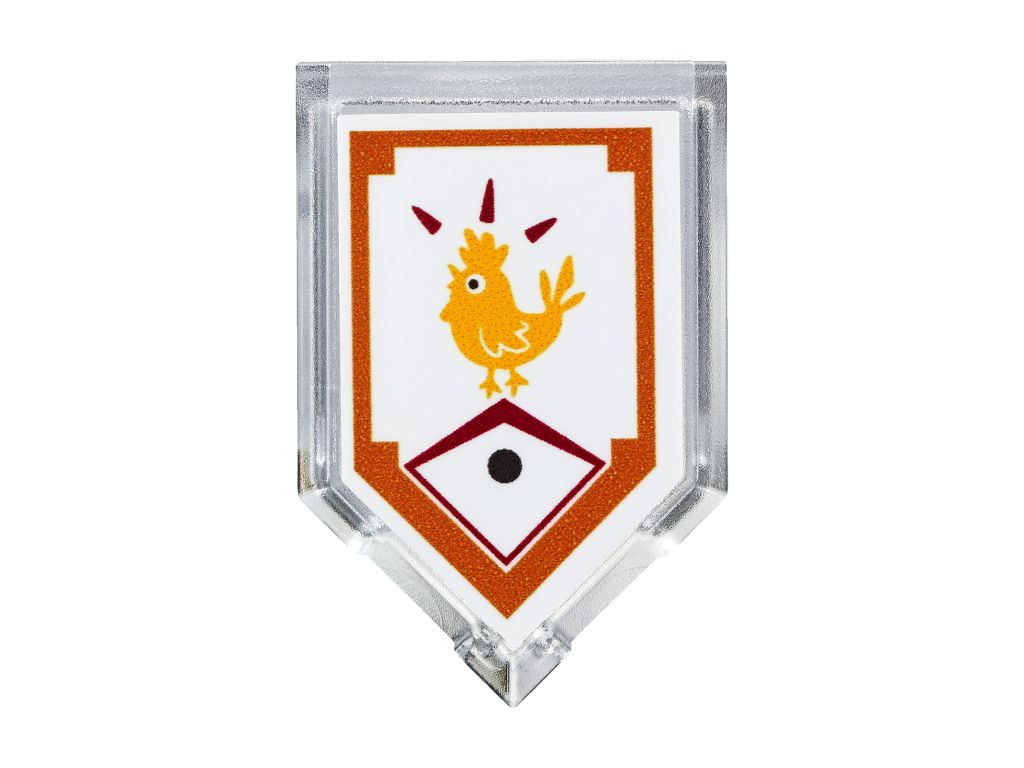 | 1 X Tile, Modified 2 x 3 Pentagonal with Nexo Power Shield Pattern - Chicken Power | Trans-Clear |   |  |