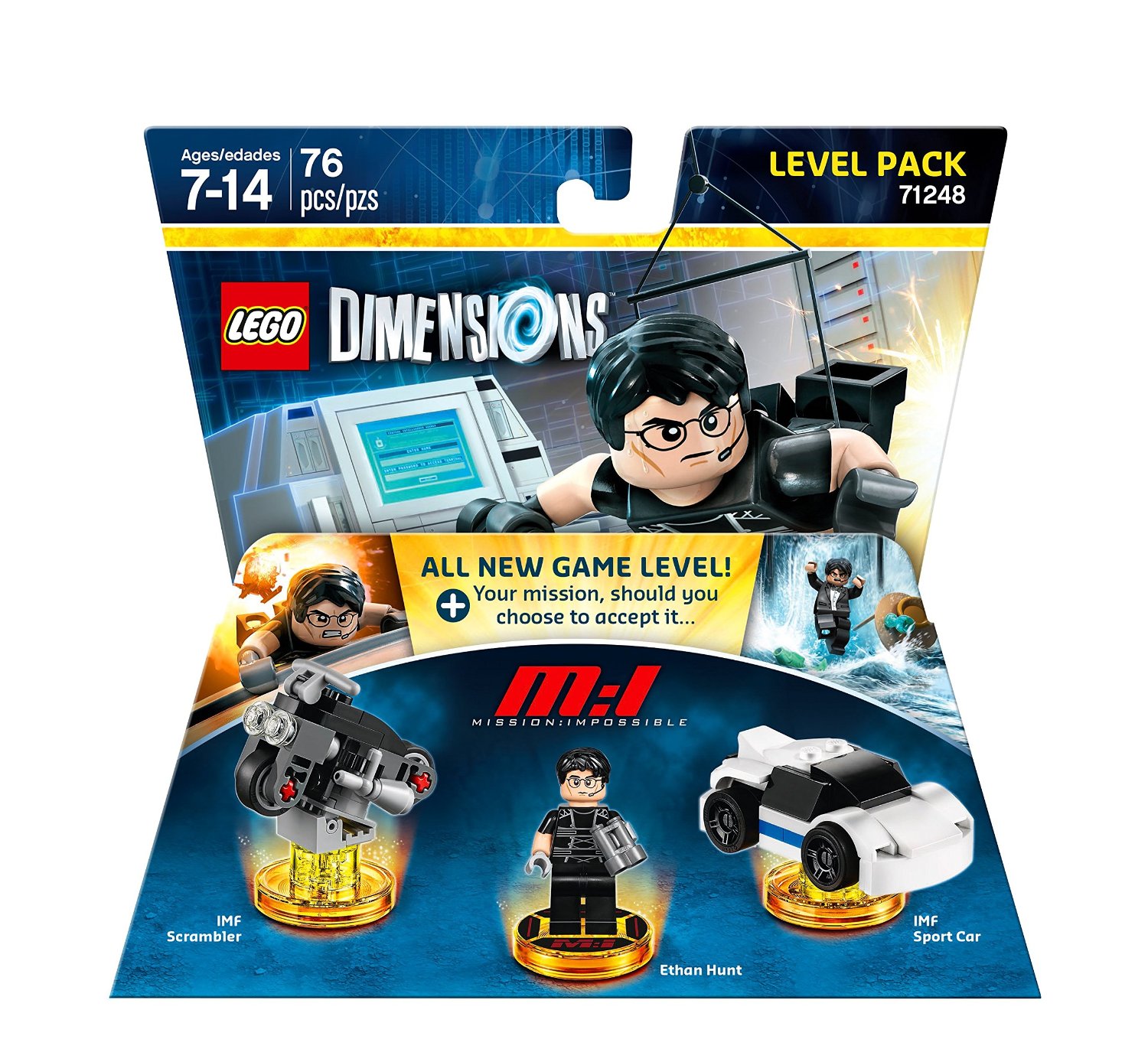 | 1 X Dimensions Toy Tag 4 x 4 x 2/3 with 2 Studs for Ethan Hunt #51 with Red Lines and 'M:I' on Black Background Pattern | Trans-Yellow |   |  |