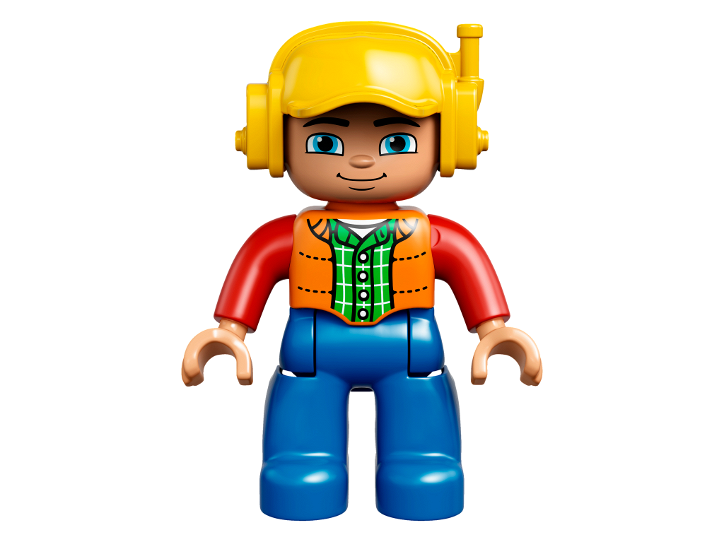 Duplo Figure Lego Ville, Male, Blue Legs, Orange Vest, Dark Green Plaid Shirt, Red Arms, Yellow Cap with Headset