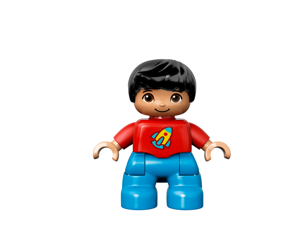 Duplo Figure Lego Ville, Child Boy, Dark Azure Legs, Red Top with Space Rocket Ship, Black Hair
