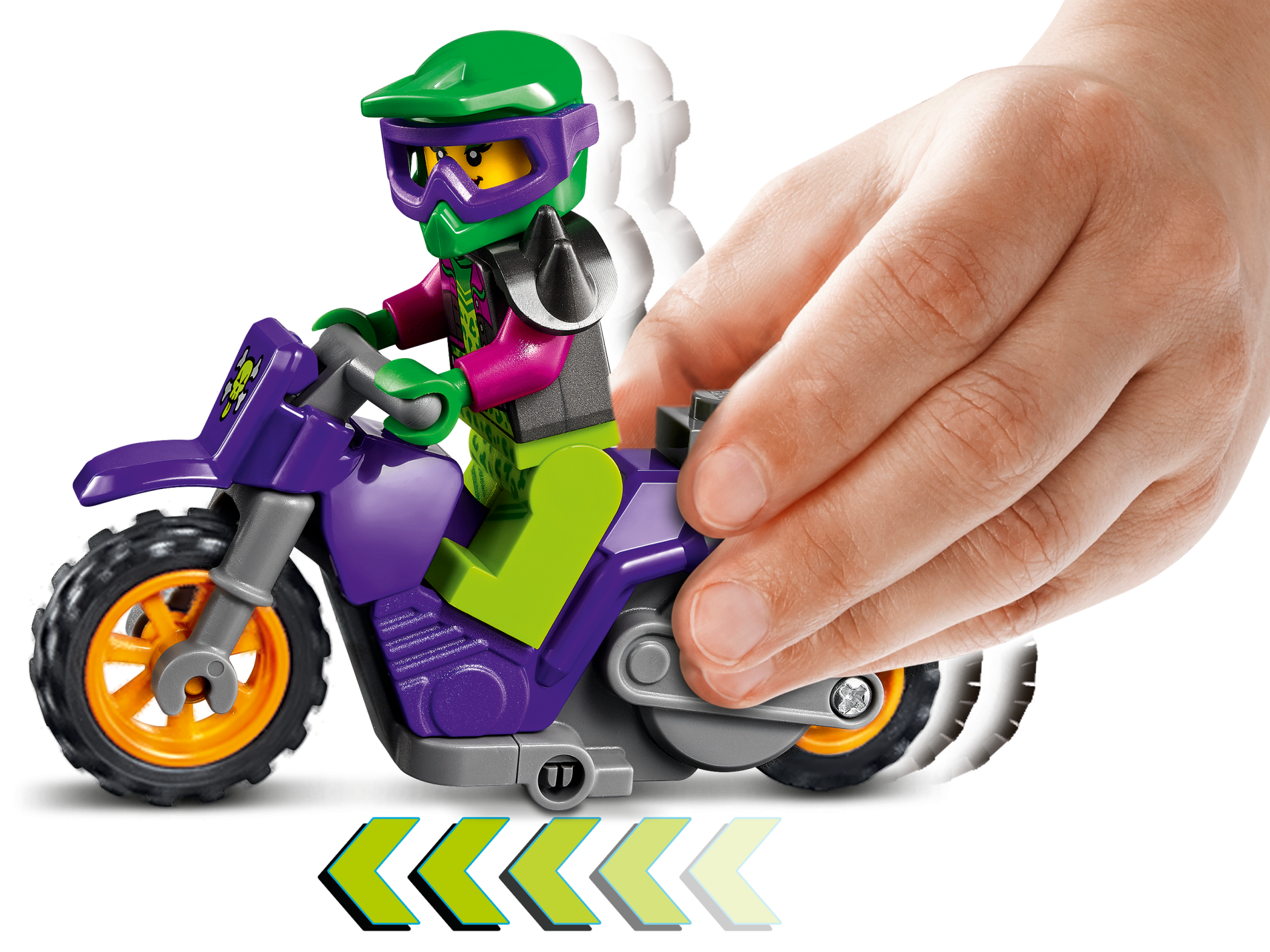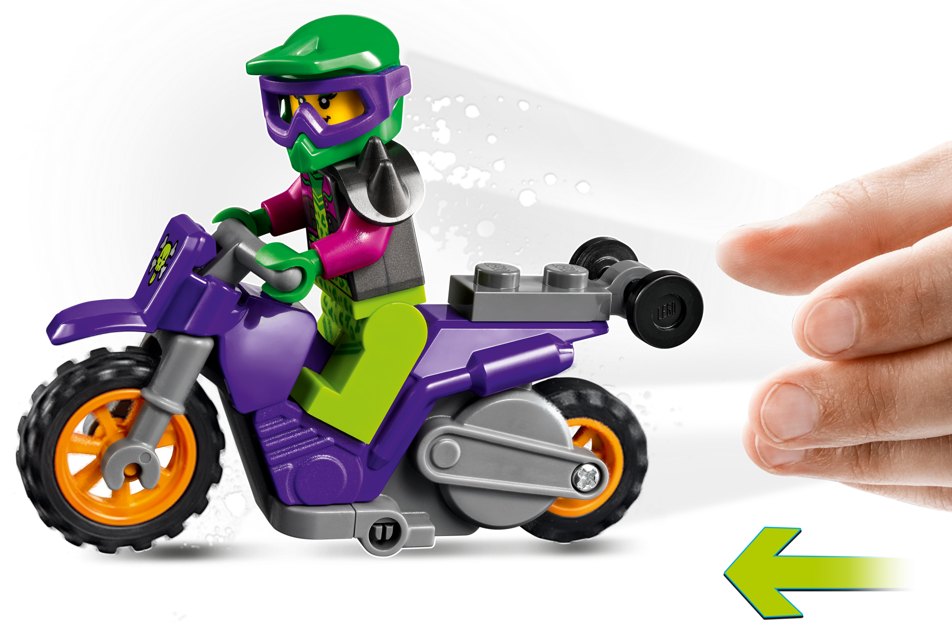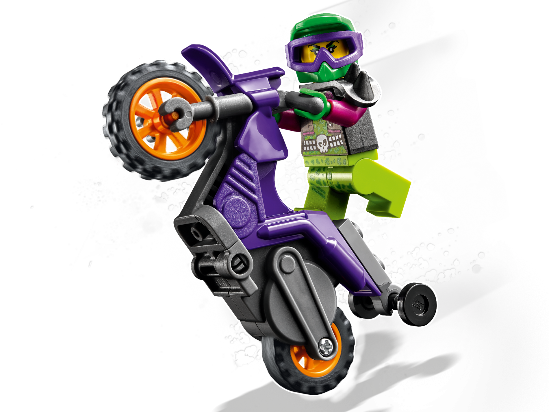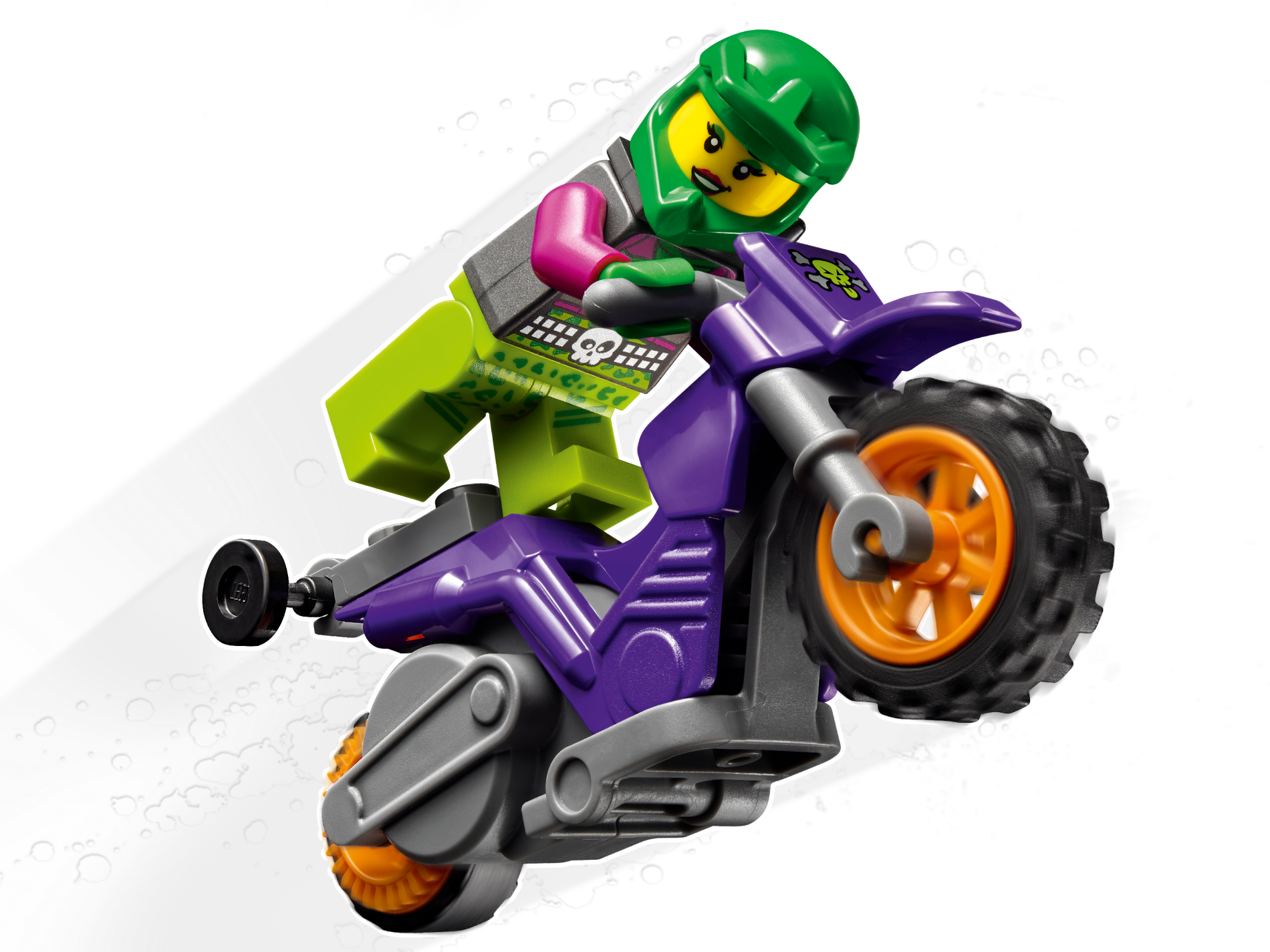 Stuntz Flywheel Motorcycle Dirt Bike with Dark Bluish Gray Frame and Handlebars, Orange Wheels, and Lime Skull, Silver Crossbones Pattern